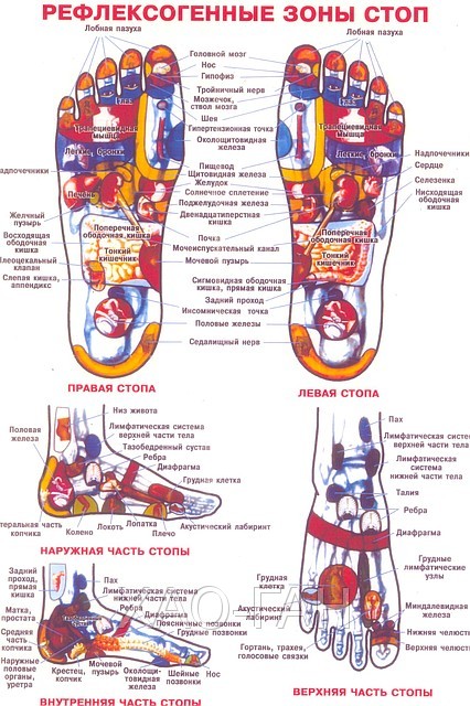 Общее количество «жизненных точек» — 365. Их месторасположение не зависит от того, где находится больной орган. Другими словами, чтобы облегчить боли в сердце, не обязательно воздействовать на область сердца — биологические точки находятся, например, на стопе. Причем на стопе находятся точки, воздействующие на множество других органов и использующиеся при различных заболеваниях. Зачастую для устранения болей в правой стороне приходится массировать точки, находящиеся в левой, и наоборот.